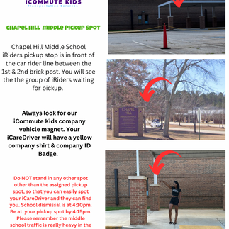 Below we will show the exact pickup spots for our middle and high school iRiders. Please be sure to save, print or send your iRider their school pickup spot photo.